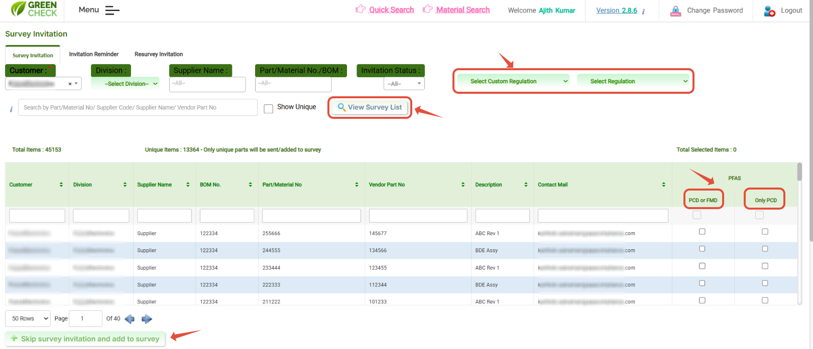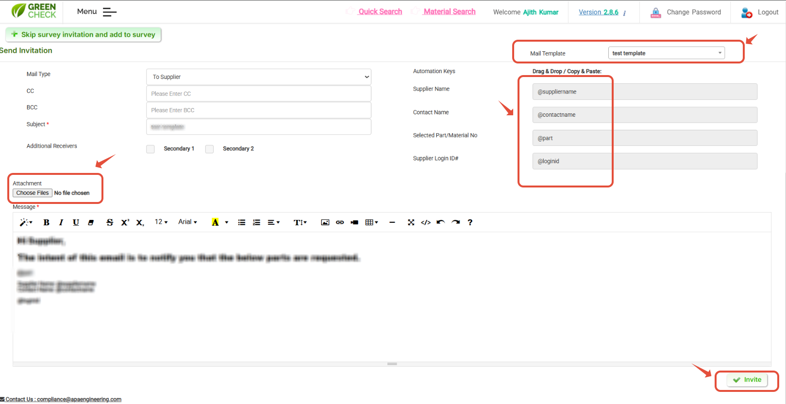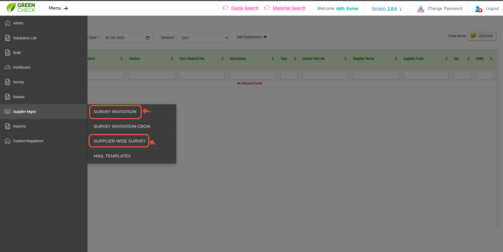 - After logging in, use the menus: Menu--> Supplier Mgmt-->Survey Invitation / Supplier-wise survey invitation.