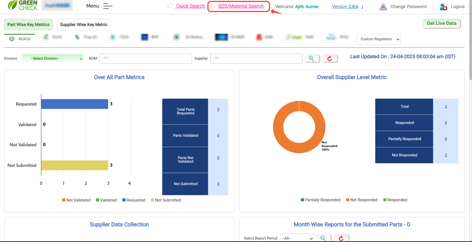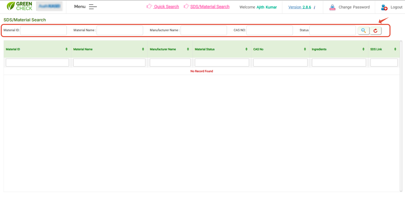 - Hit on "SDS /Material search", the page with filters will be loaded