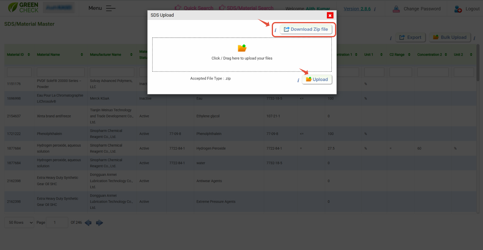 - Load SDS material details export data in "Material_Master_Template"