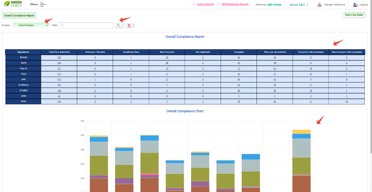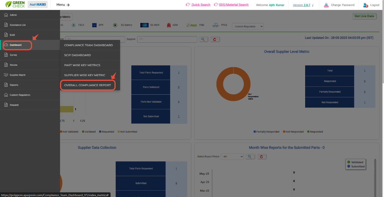 - After logging in, use the menus: Menu--> Dashboard-->Over all Compliance report.