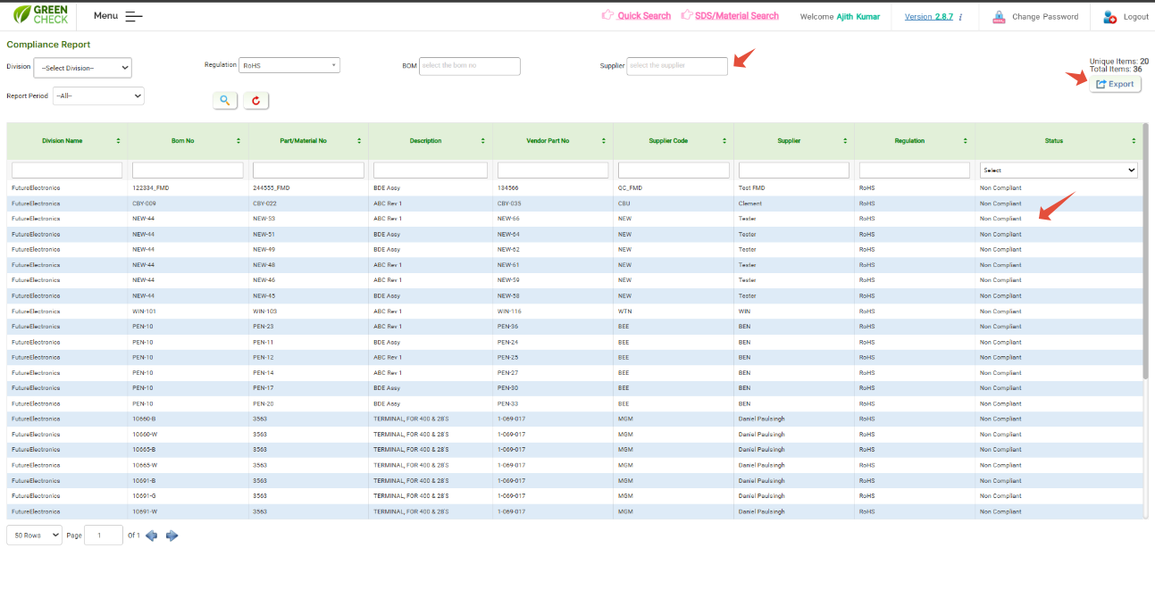 - Also, you can view the BoM-wise report with respective regiulation status regulation.